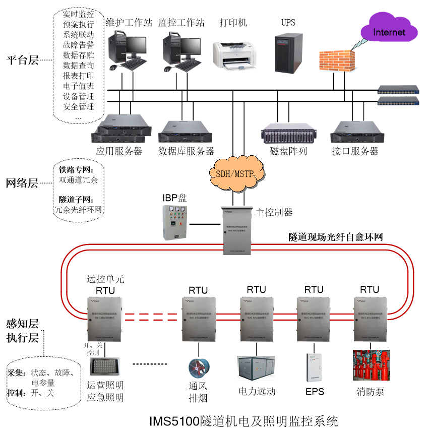 IMS5100隧道机电及照明监控系统主要用于铁路隧道防灾救援疏散及照明等机电设备的远程监控,实现对防灾通风、正常照明、应急照明、疏散指示、消防泵、防护门等机电设备的综合监控、故障报警及调度管理。当隧道内发生火灾或其它紧急事故时,系统能够根据预生成的防灾救援预案对隧道防灾救援和照明设备进行一键式控制,达到防灾减灾的目的。
